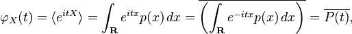 여기서 p(x)는 X의 확률 밀도 함수고, P(t)는 푸리에 변환이다. 여기서 특성 함수와 푸리에 변환 간의 유일한 차이는 지수 표기법 뿐인데, 이는 표기법 선택의 문제다. (P(t) 위에 그려진 바는 복소수 켤레값을 나타내며, 이는 지수 표기법 상 사용된 것이다. )